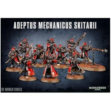 Les Skitarii Rangers en capuche et masque à gaz traquent leur proie avec leur fusil galvanique. Chaque soldat est engonçé dans une lourde brigandine Skitarii de fabrication industrielle, frappée du symbole de l’Adeptus Mechanicus, hérissée de capteurs de données, d’antennes et de senseurs environnementaux. Du fait du terrain hostile de Mars, ils ont les jambes remplacées en dessous du genou par des prothèses bioniques qui renforcent l’air froid et cybernétique des figurines.