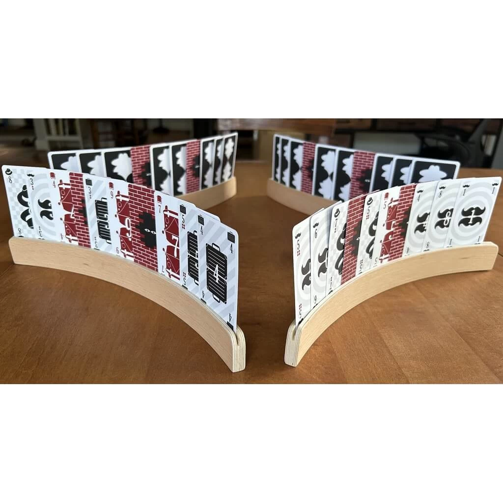 Walls have no numbers, cannot win tricks, and are used to separate the shared hands. They can be played at any time (as long as there is not already a Wall played into a trick) but cannot be led unless you have no other cards available. If a Wall is led, the next player sets the lead suit. Walls are worth 2 points when scoring a trick.