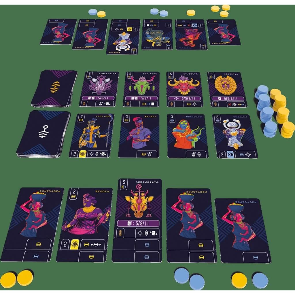 Àiyé jette un regard neuf sur l’un des plus anciennes mécaniques des jeux de société, l’awalé. À chaque tour, les joueurs sèment des graines d’énergie sur un awalé composé de colonnes de cartes, activant les capacités de la dernière colonne semée. Au cours de la partie, les joueurs développent et améliorent leurs colonnes, construisant ainsi un awalé unique plein de possibilités et de combinaisons.