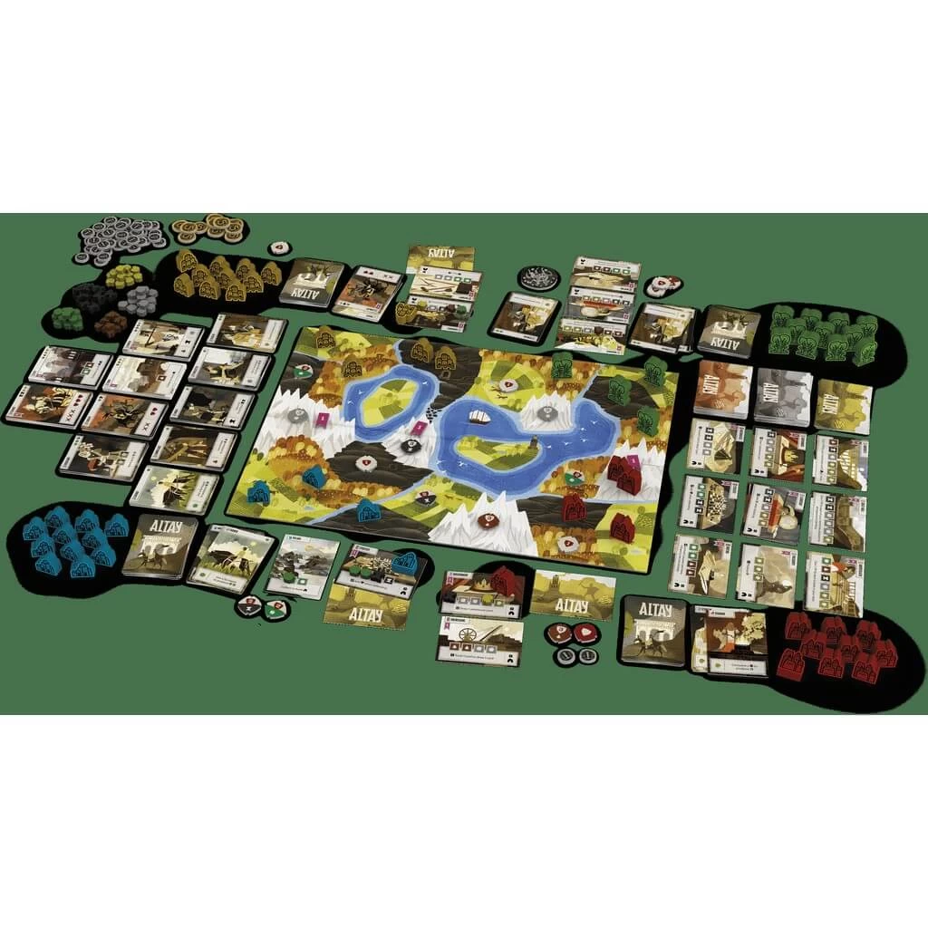 Altay: Dawn of Civilization is an original blend of deck-building, civilization development, and area expansion. Players control one of four factions, each represented by a starting deck with unique cards and with subtle differences in the number of « basic » cards. Each turn, players use their cards to produce resources (stone, metal, wood, knowledge), build new settlements and expand on the board, attack or defend against their enemies, or manipulate their decks or card hand.