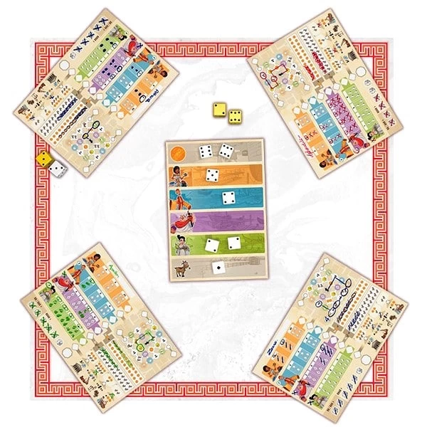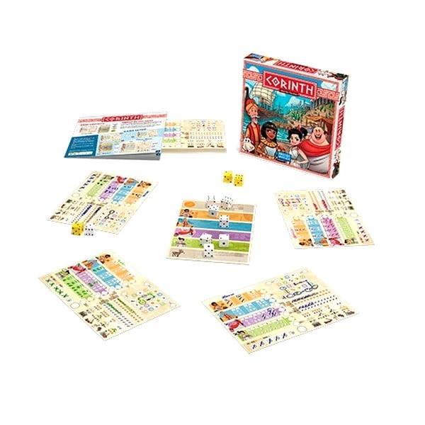 Dans Corinth, à chaque manche, une poignée de dés est lancée et les joueurs, tour à tour, en choisissent un groupe et les utilisent pour livrer des marchandises, acheter des troupeaux de chèvres ou visiter le marché, enregistrant leur progression sur leur fiche.