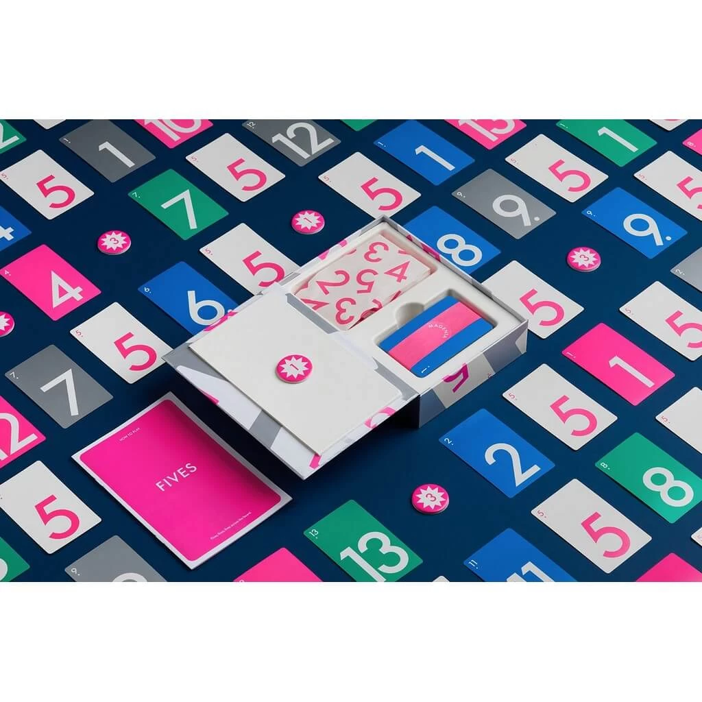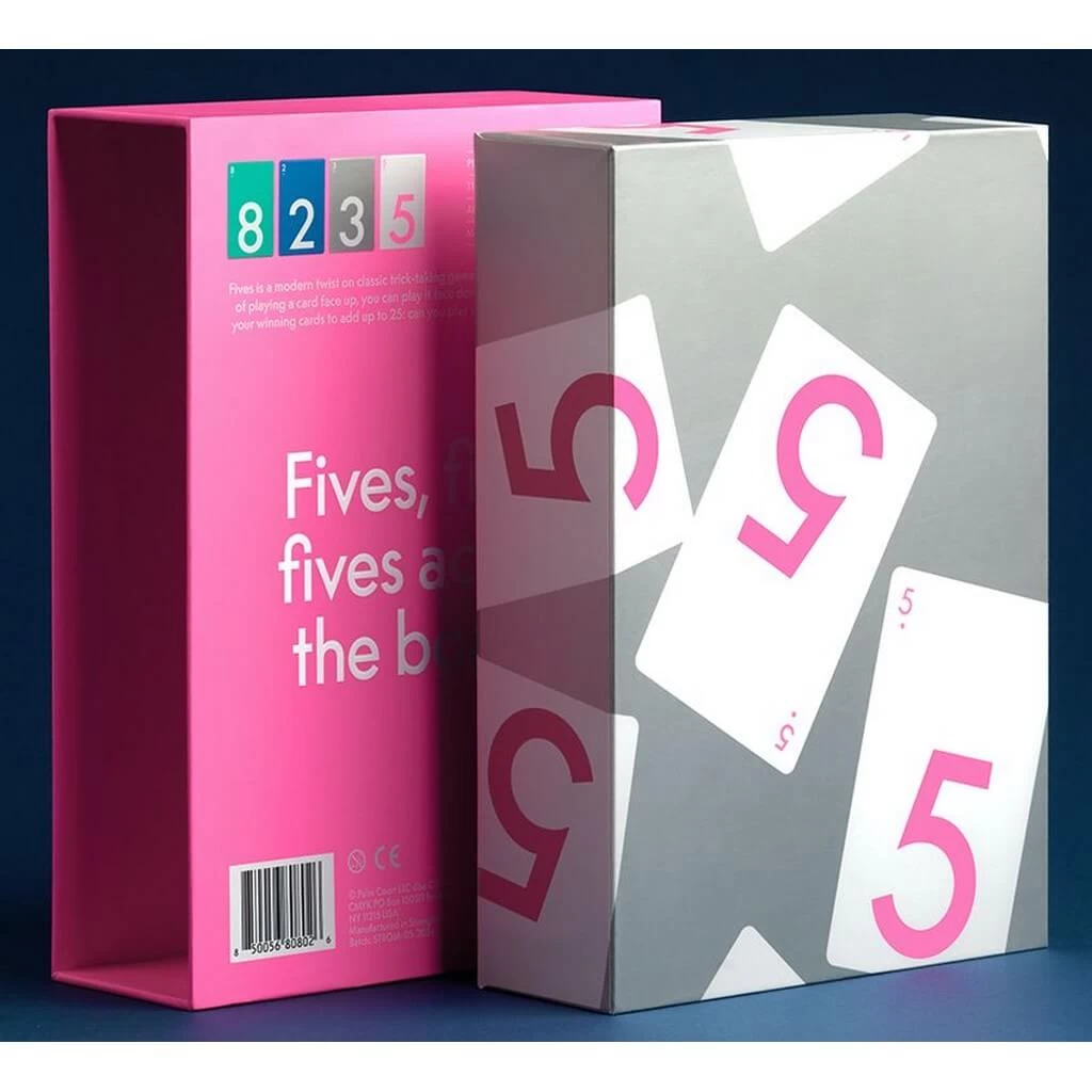 Fives is a trick-taking game for three or four players. The reverse side of the cards shows a magenta 5.
