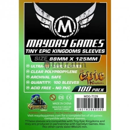 Sleeves Transparents 88 x 125MM 100P Mayday Games – Pochettes de protection Custom Tiny Epic Kingdoms pour cartes compatibles pour les cartes des jeux européens. Chaque paquet contient 100 pochettes souples au format 88 mm par 125 mm.