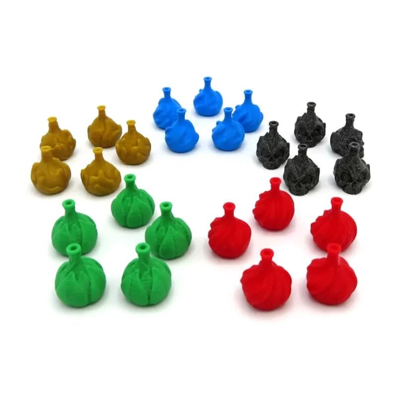 Remplacez les pions en bois du jeux par ces adorables fioles qui composent le Set d’Essences : Res Arcana. Elles prendront place dans le thermoformage d’origine.